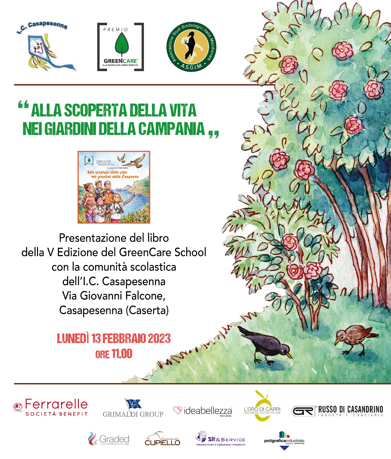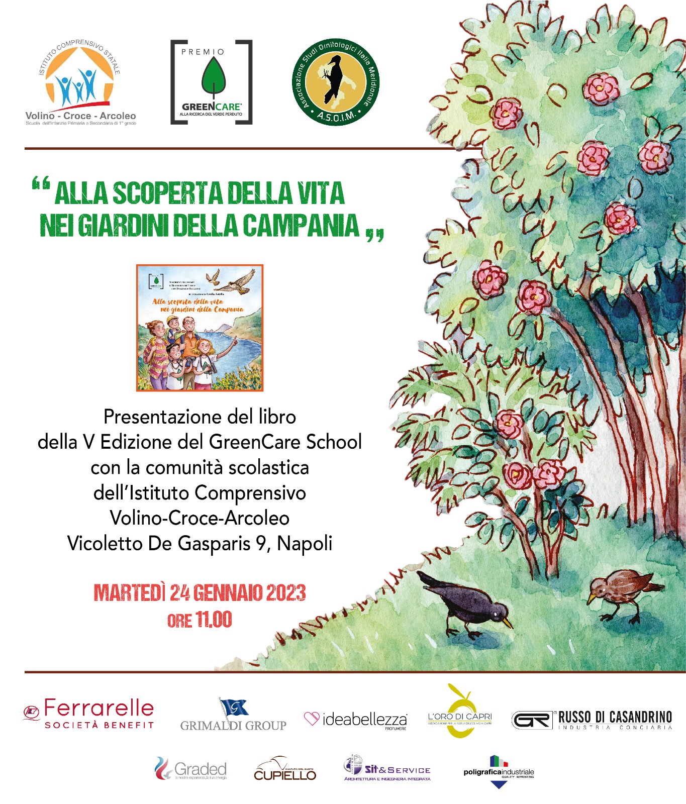 Inoltre, sono stati tre gli incontri con le scuole per promuovere i contenuti del libro “Alla scoperta della vita nei giardini della Campania”. Nel mese di gennaio ’23 siamo stati invitati all’Istituto Comprensivo Volino-Croce-Arcoleo a Napoli assieme all’Assessore Regionale all’Istruzione Lucia Fortini ed al presidente del Fai Campania Michele Pontecorvo Ricciardi. Nel mese di febbraio, invece, abbiamo incontrato la platea scolastica dell’I.C. Casapesenna a Casapesenna, in provincia di Caserta. Infine, ad aprile 2023, il GreenCare è stato invitato a Quarto per trascorrere una giornata con gli studenti e le studentesse del Don Milani.