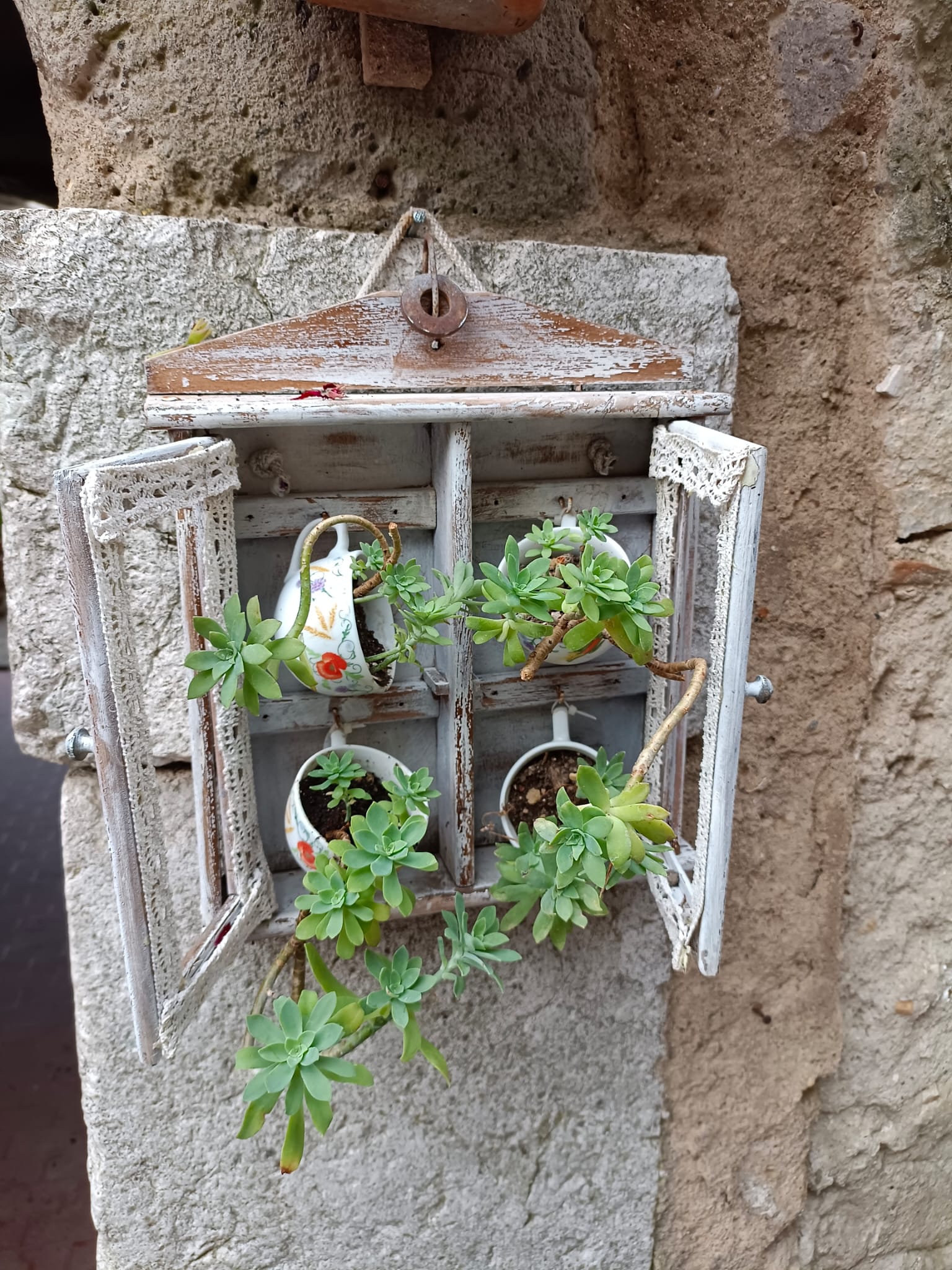 Molte le pergole di uva, di limoni e di glicine dolce riparo dalla calura estiva arrivata presto quest’anno. Le piante grasse come il sedum o l’echeveria hanno trovato pregiata dimora in tazzine di porcellana. Quest’anno ho avuto modo di osservare e riflettere su come le numerose piante annuali o stagionali esotiche acquistate per gli allestimenti floreali convivano con gli alberi e gli arbusti, alcuni nostrani, piantati negli anni passati o nati spontaneamente nei giardini, nei cortili e in alcuni angoli nascosti del borgo.