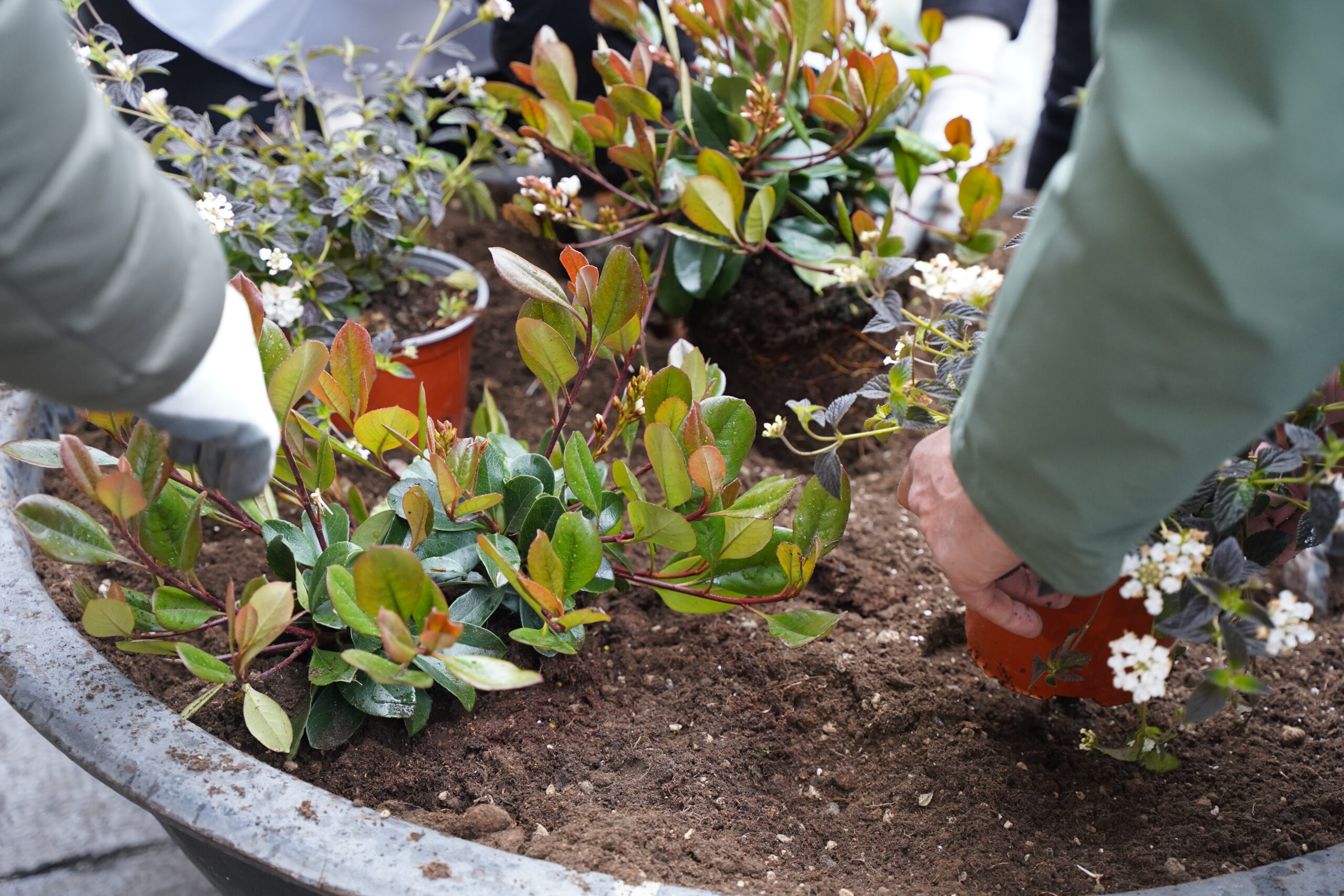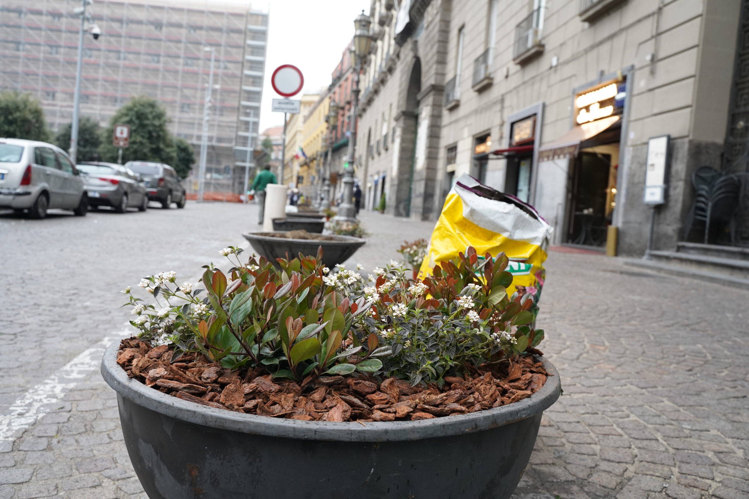 Messe a dimora 84 piante di Lantana sellowiana a fiore bianco e di Raphiolepis umbellata per abbellire le fioriere all’ingresso della Casa dei Napoletani. Le fioriere sono state decorate anche con corteccia di pino naturale per un effetto finale di cura e protezione delle radici.